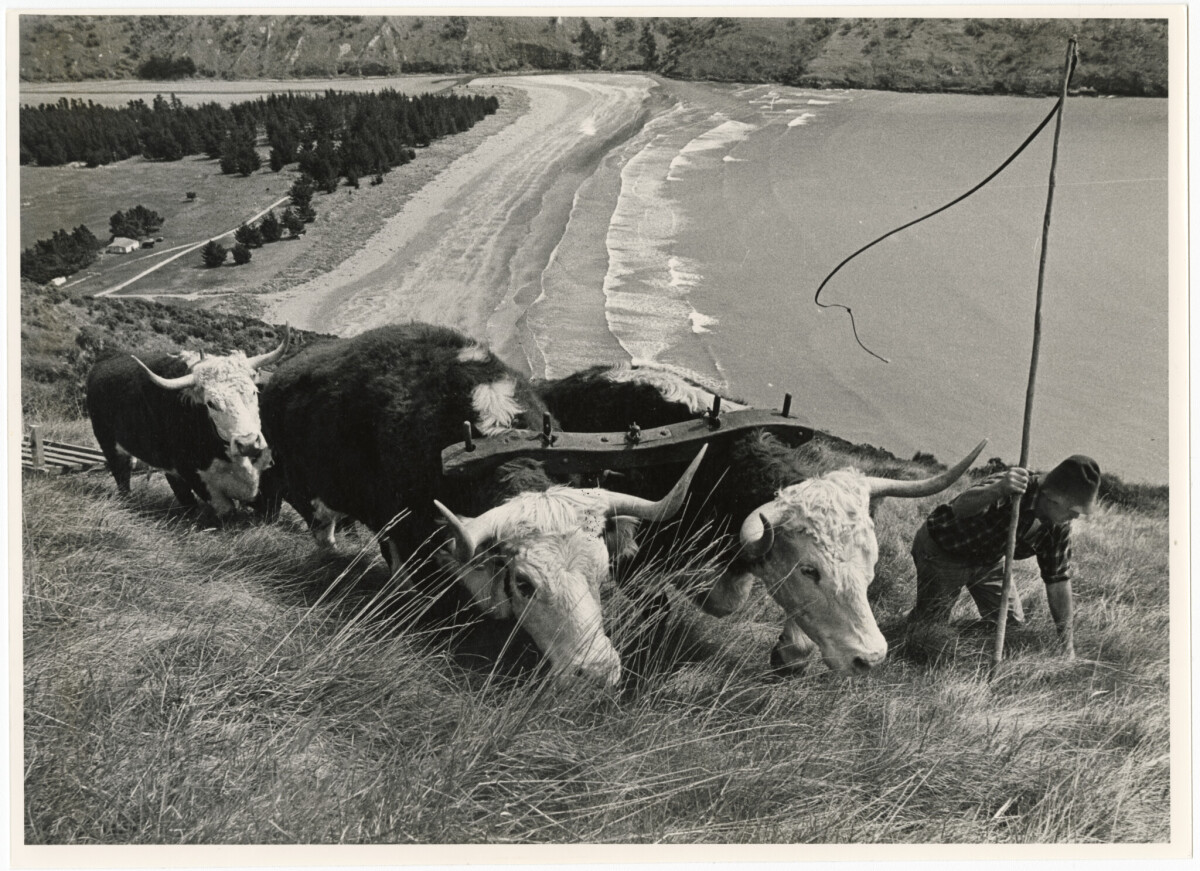 View of the Murray Thacker bullock team on the Banks Peninsula, near Okains Bay.