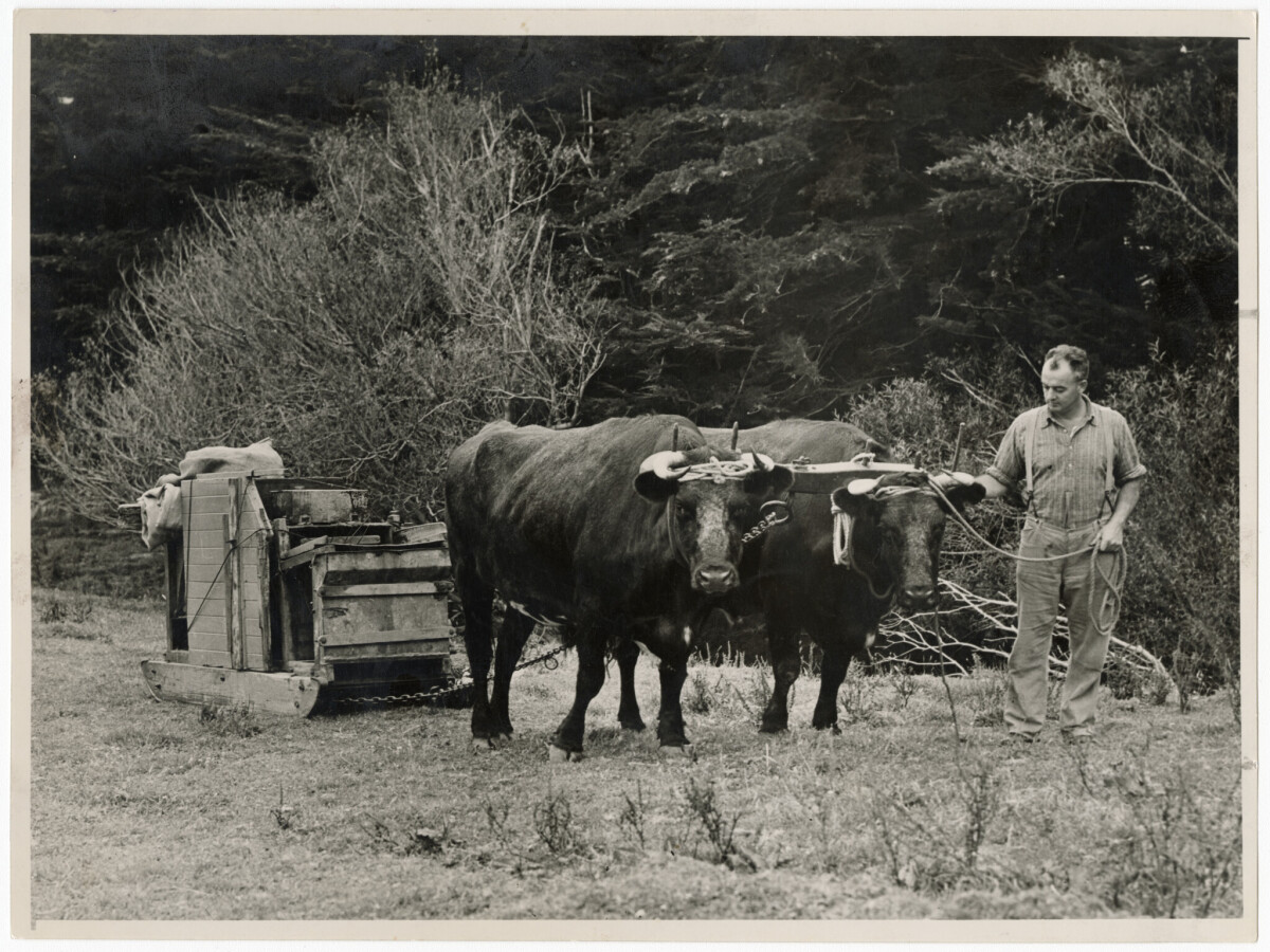 View of a bullock team pulling farm equipment at Le Bons Bay on the Banks Peninsula.