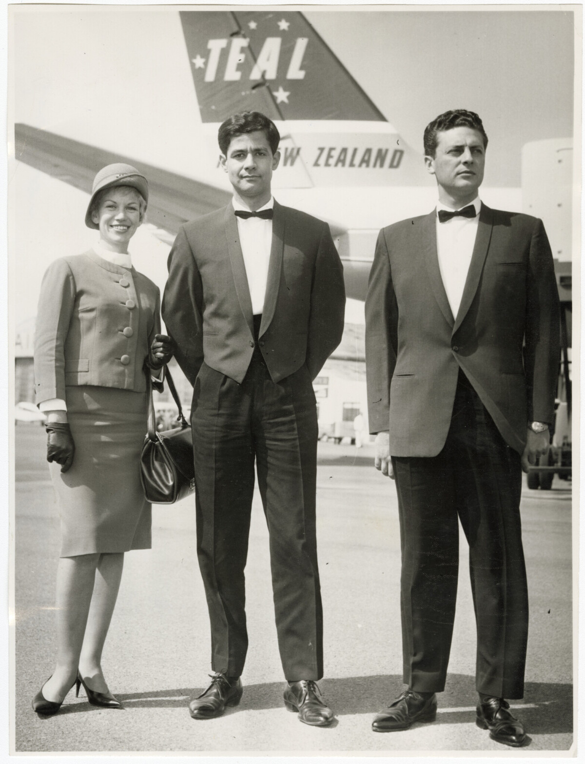 Staff modelling new Air New Zealand cabin crew uniforms at Christchurch Airport. Female staff wear a Dior- designed turquoise uniform whilst the men wear dark blue jackets. Pictured are, from left, Patricia Winkel, Les Smith and Peter Aldridge.