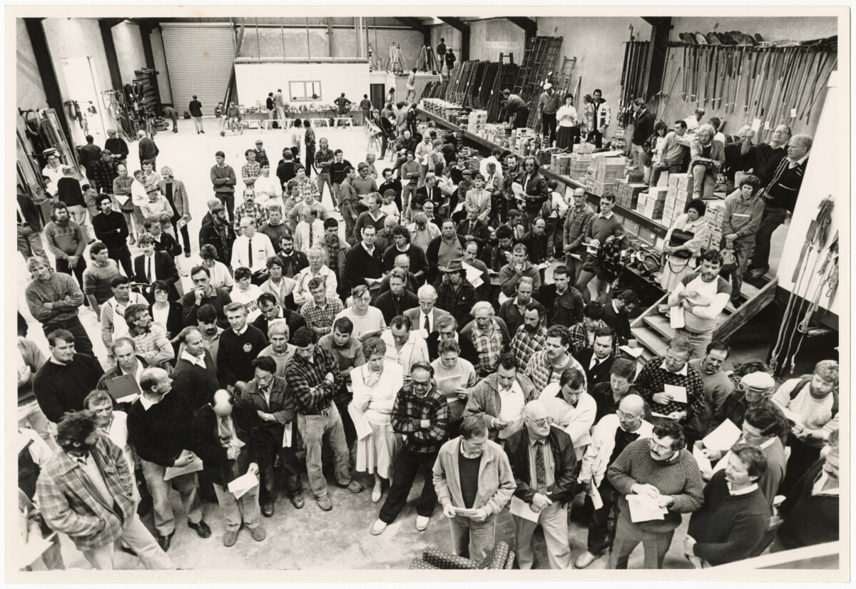 Crowds in the main depot area of the Paynter Construction Watts Road site in Sockburn, during an equipment auction being held as a result of the company closing.