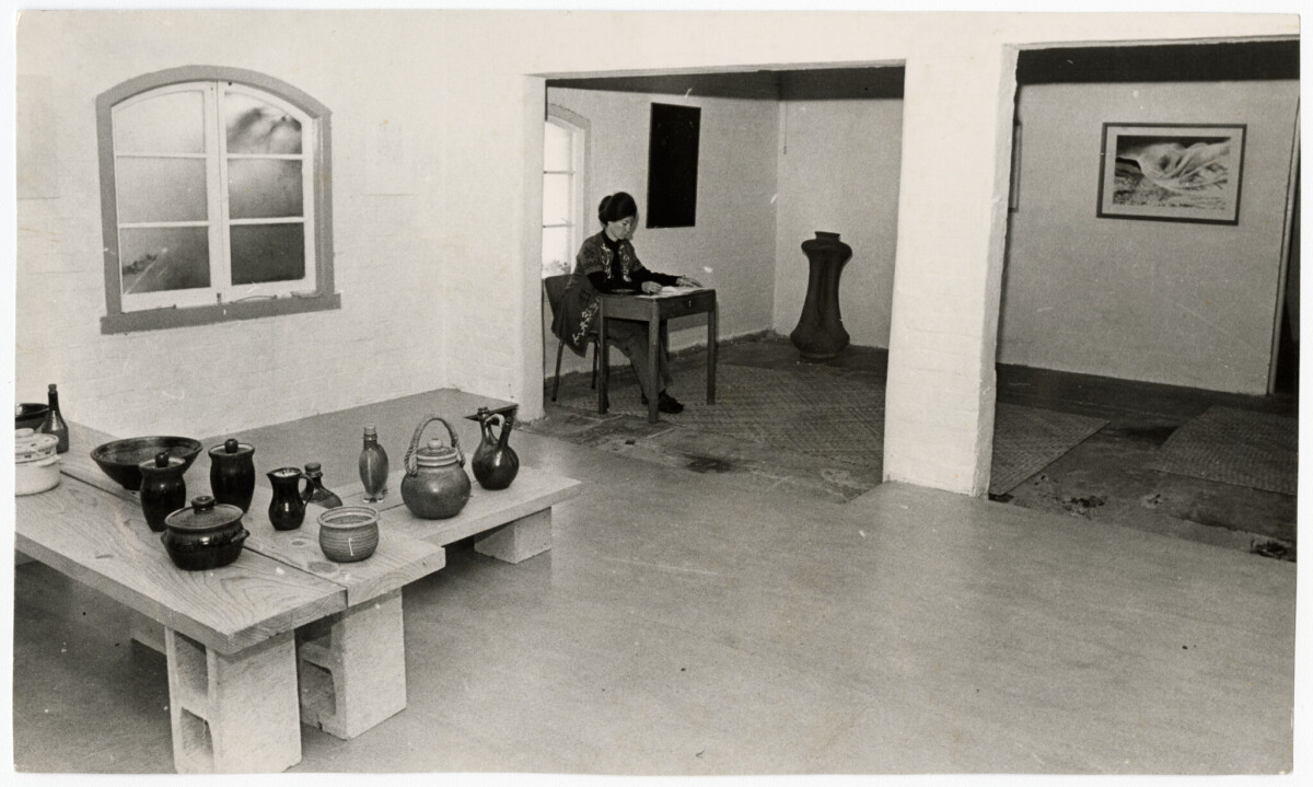 Interior of the Bosshard Gallery in Rue Pompallier, Akaroa with a pottery display in the foreground.
