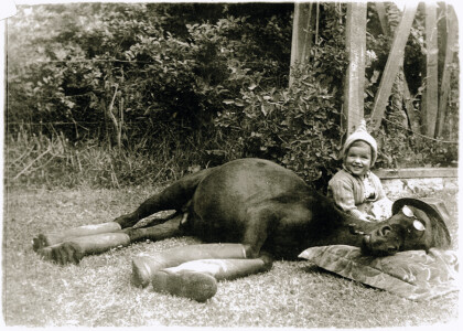 Child sitting beside dressed up horse