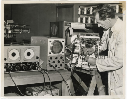 M. Bryant testing television chassis on an oscilloscope before ...