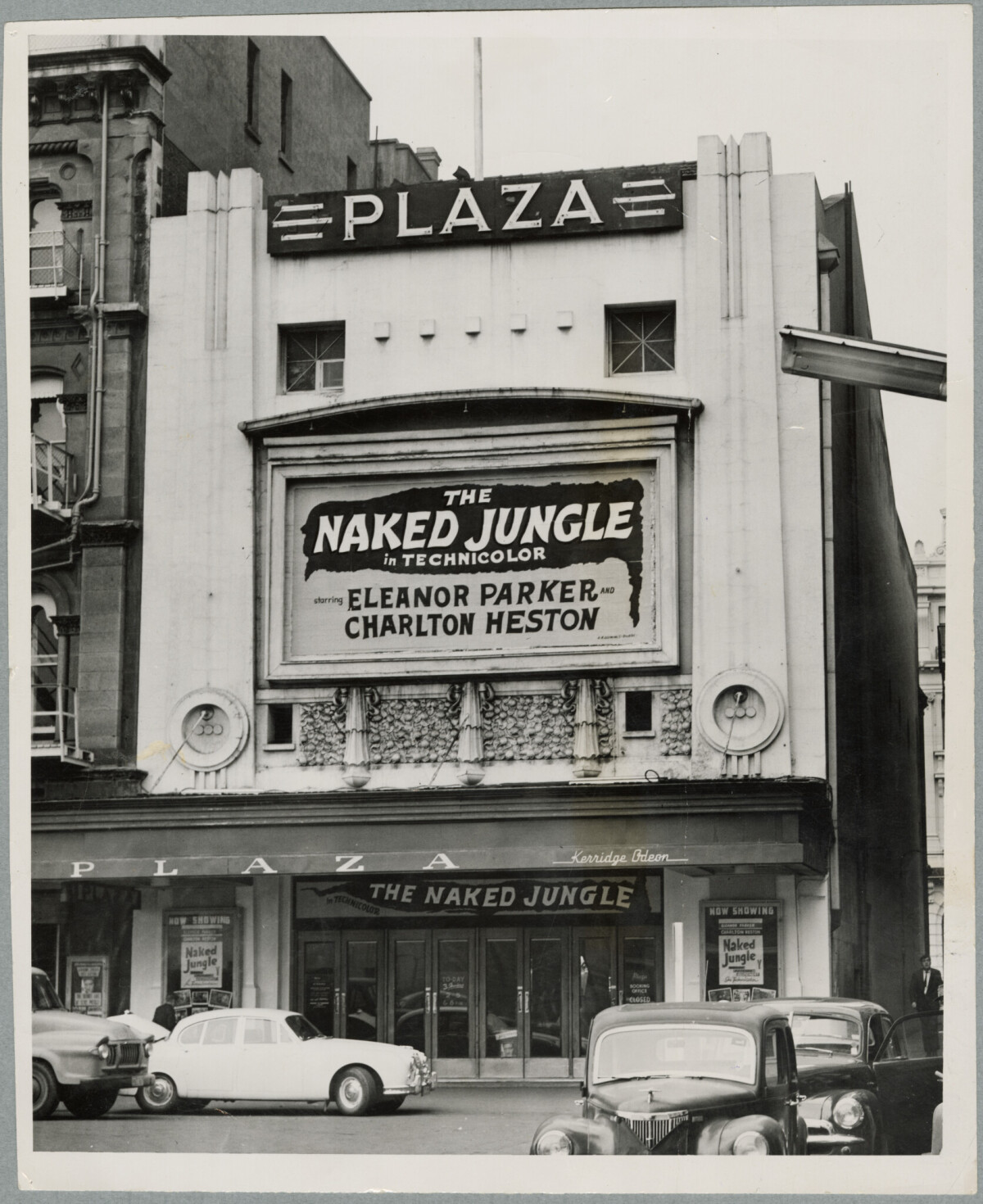 Exterior of the Plaza Theatre in Cathedral Square with advertising for The Naked Jungle.