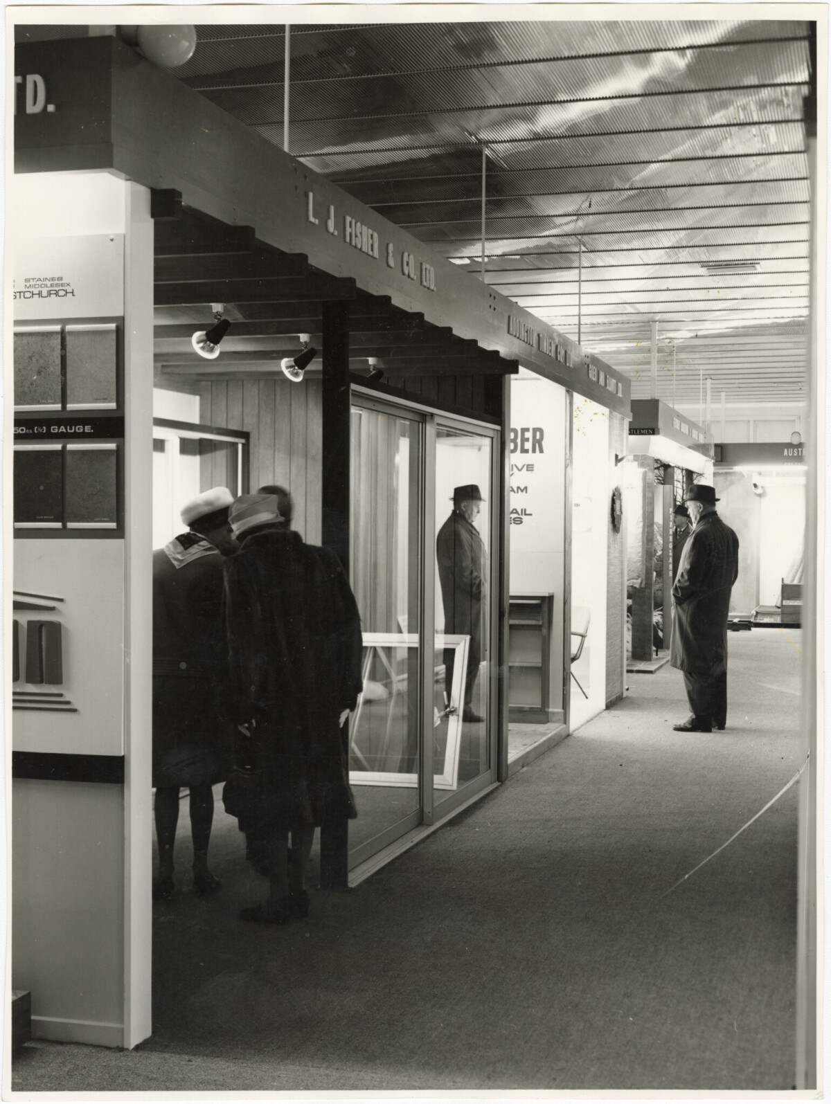 View of various displays, including those by L. J. Fisher & Co. Ltd and the Addington Timber Co. Ltd in the Building Centre at 211 Cashel Street.
