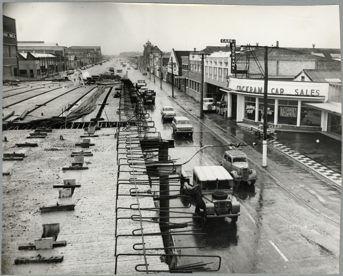 View during the construction of the Colombo Street overhead bridge looking west along Moorhouse Avenue.
