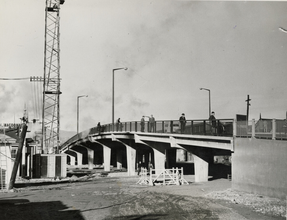 View of the newly completed Colombo Street railway bridge over the railway lines in Sydenham looking south.
