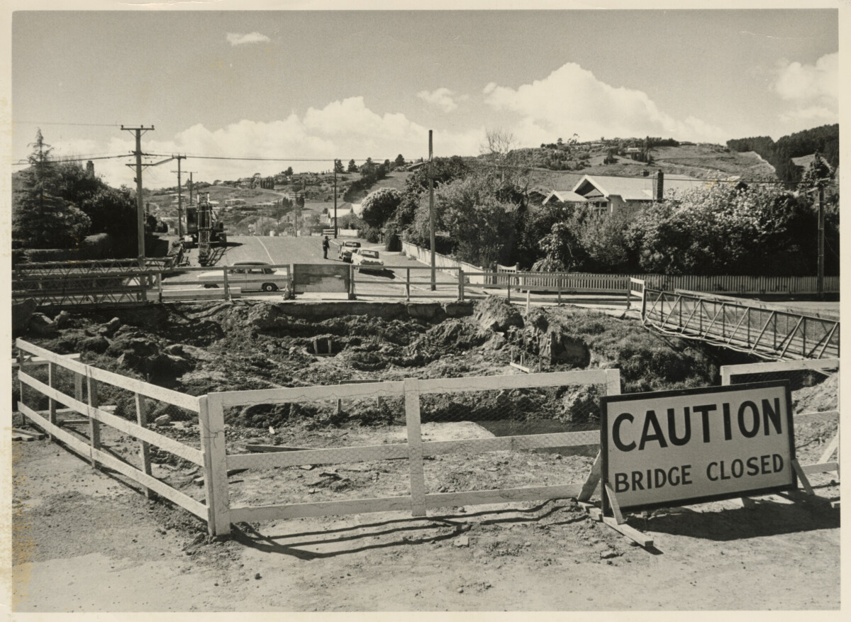 View of the construction site for the new Malcolm Avenue bridge crossing the Heathcote River in Beckenham, looking towards the intersection with Waimea Terrace.