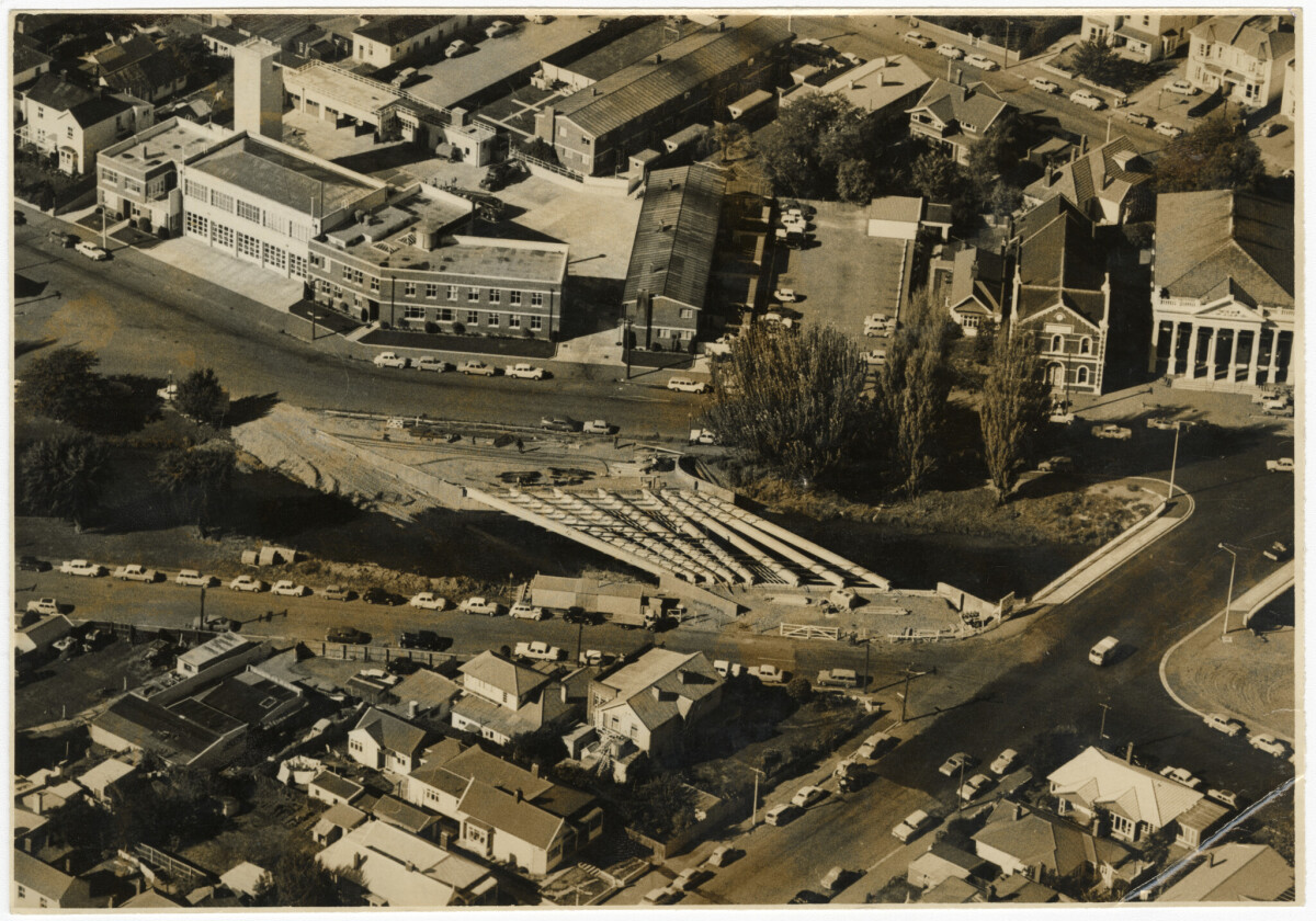 Aerial view of the construction of the Kilmore Street bridge over the Avon River at the intersection of Kilmore Street, Madras Street, Cambridge Terrace and Oxford Terrace.