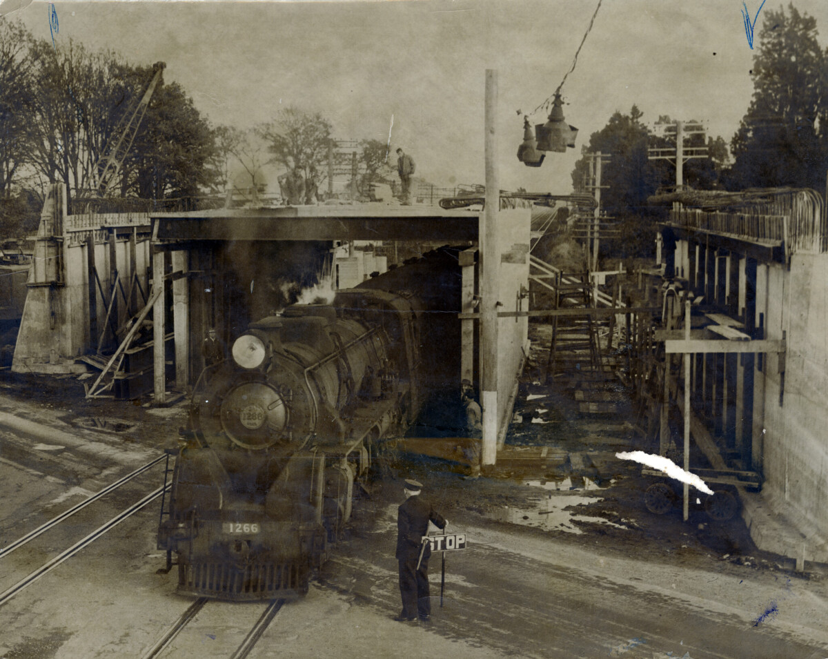The Springfield-Christchurch steam train passes beneath a section of the new overhead bridge during construction at Sockburn.