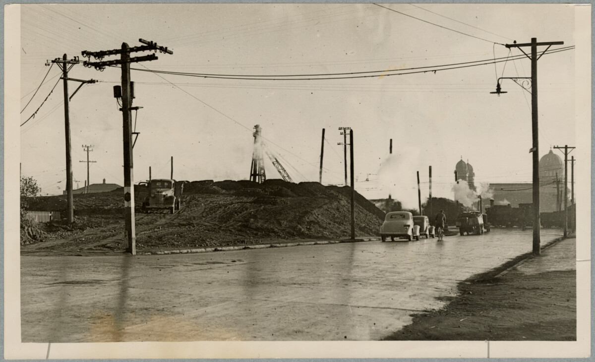 View during the construction of the Waltham Road overhead bridge looking north towards the Cathedral of the Blessed Sacrament.