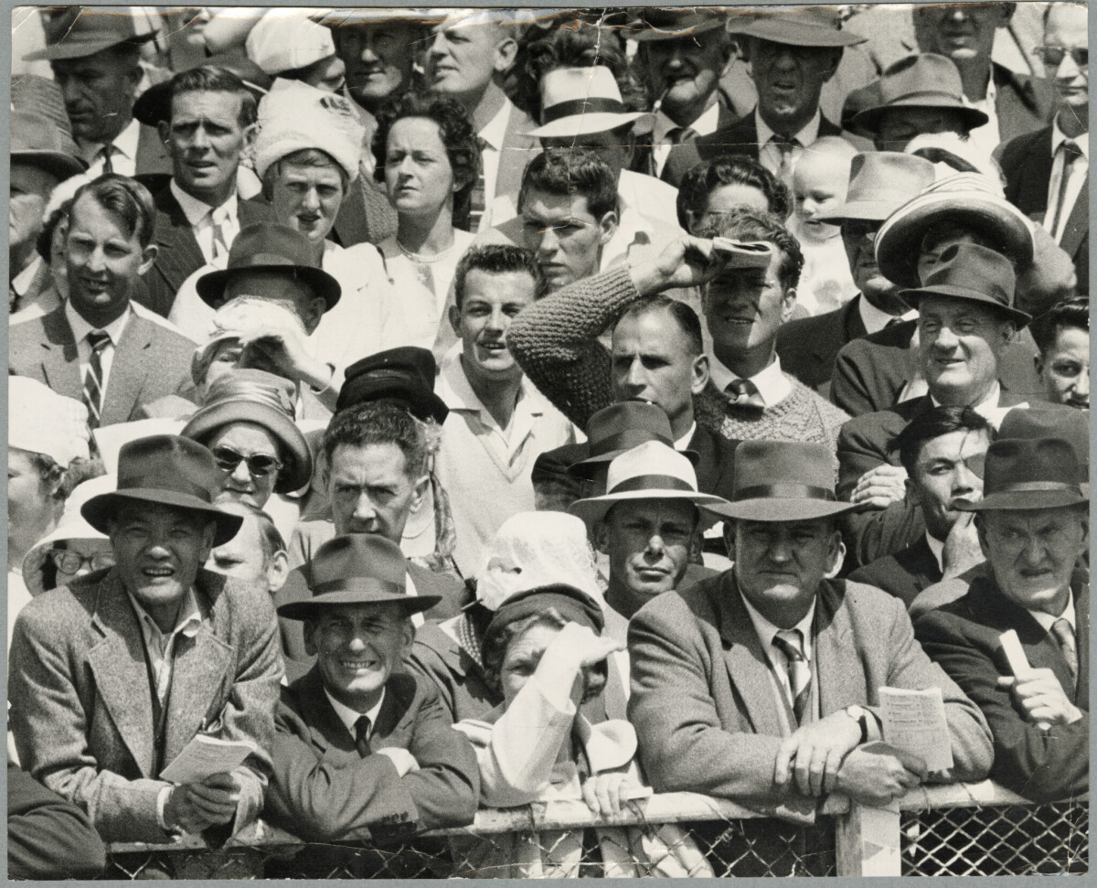 A crowd watching trotting events at the 1963 New Zealand Cup at Addington Raceway.