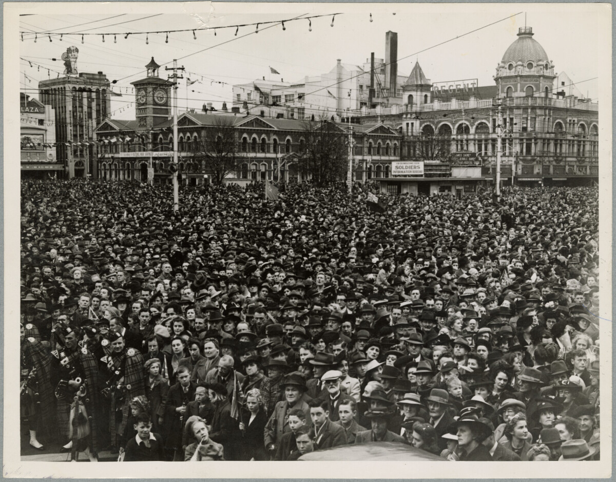 View of a large crowd gathered in Cathedral Square. Amongst the crowd a flag of the Soviet Union is seen.