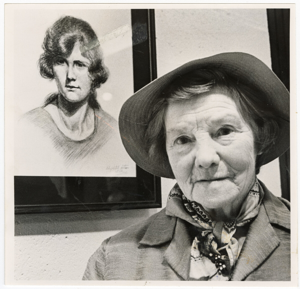 Christchurch artist, Chrystabel Aitken with her 1923 self-portrait in charcoal, part of an exhibition of works at the Canterbury Society of Arts gallery.