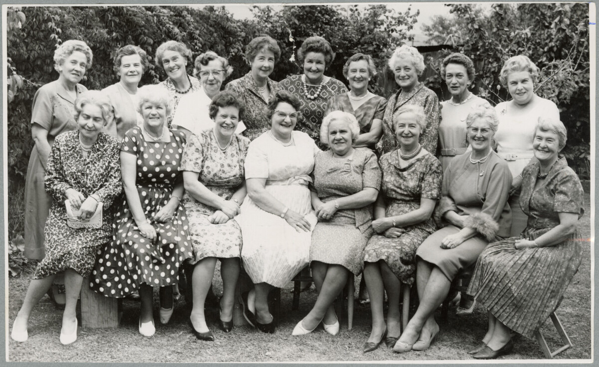 Former pupils of Form Three Upper of Christchurch Girls' High School, at a reunion. Front row (from left) Mesdames N. Young (Timaru), N. Wallace (Palmerston North), R. Fiddes, A. Woolf, D. Robb, J. Eales, F. Saunders (Temuka), E. Irving, Back row: Mesdames R. Tasker (Leeston), D. Joyce, C. Poore, Miss A. Cameron, Mesdames M. Exton, W. Harvey, M. Beaton (Nelson), E. Franks, D. Edwards and I. Sullivan.