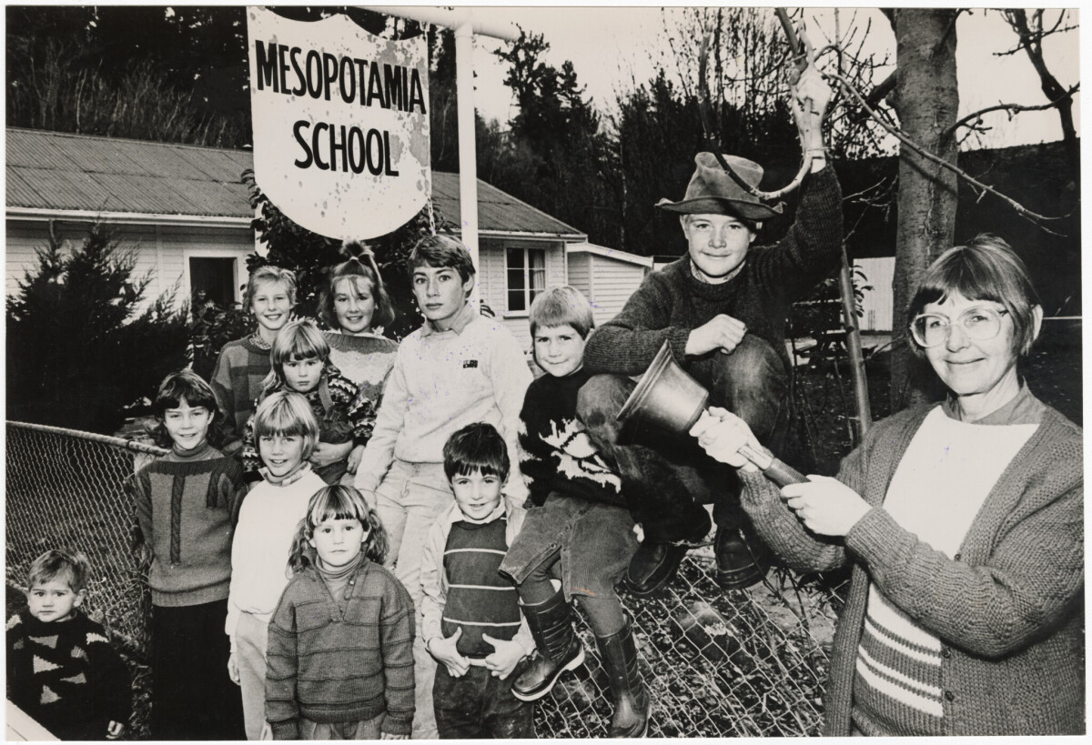 Students and their teacher, Jan Norn (right), at Mesopotamia School on the Mesopotamia sheep station and one of the New Zealand's most remote schools. Students are, from left, Aaron Prouting, Michelle Galbraith, Phillip Burnett, Melanie Prouting, Julie Prouting, Sarah Prouting, Ben Galbraith, Jessica Horton, Alice Horton and Andrew Prouting.