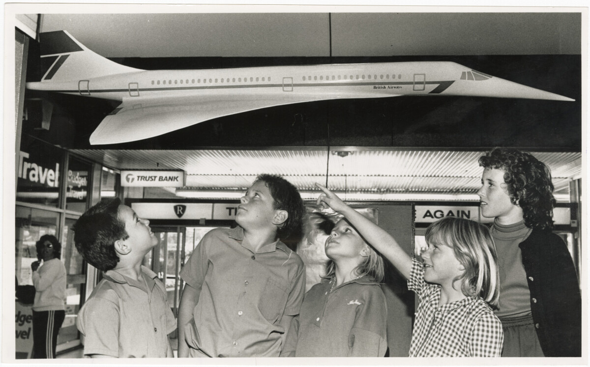 Students of Wharenui School with a papier mache model of the Concorde at Riccarton Mall. Pictured are, from left, Dallas Smith, Luke Robertson, Kelly Lloyd, Michelle Bailey and Paula Harding.