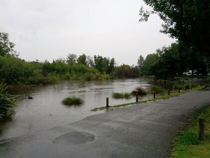Heavy rain causes high water level in Horseshoe Lake, Burwood.