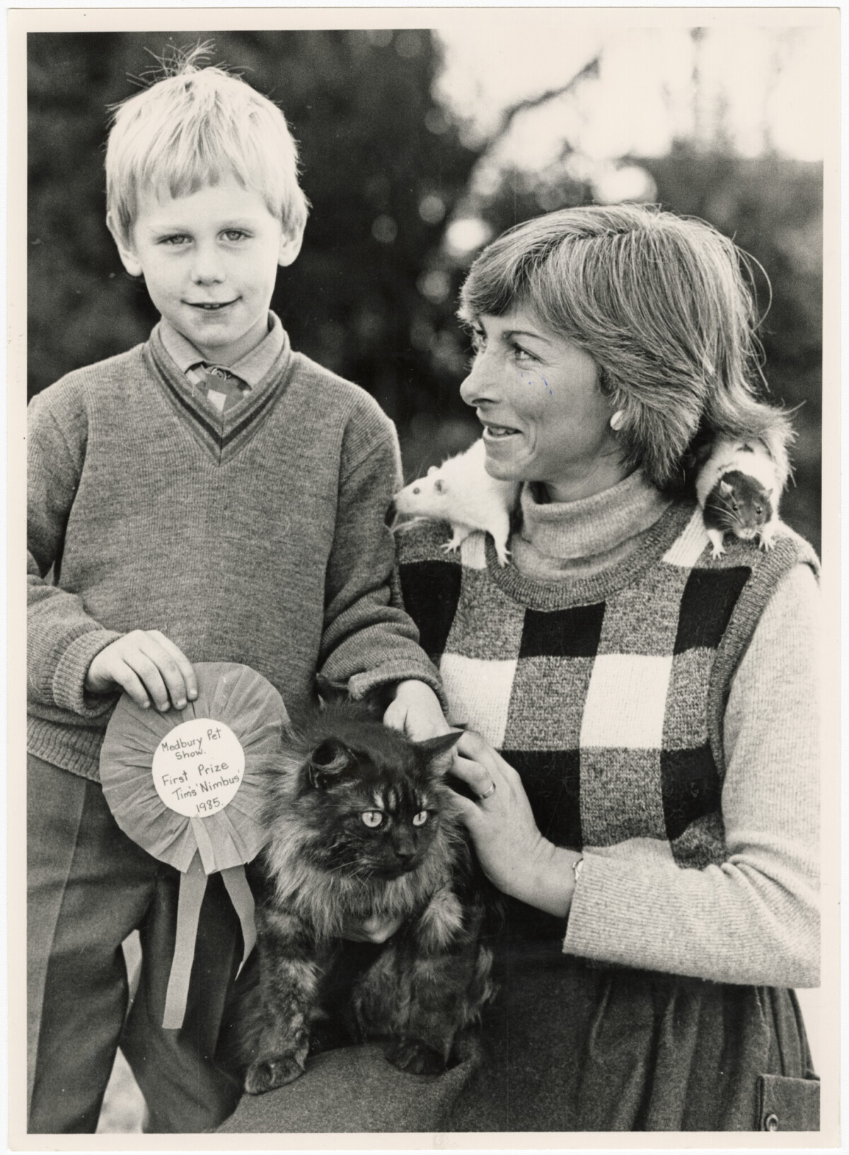 Tim McInnes with mother, Dianne, and his pets, Nimbus the cat, Lisa and George the rats, at Medbury School pet show.