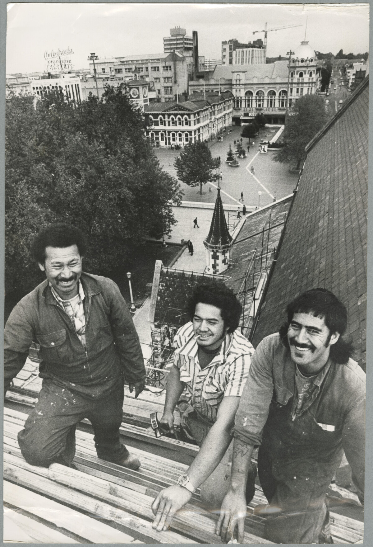 Oi Sagapolu, Watene Ruha and Lindsay Berryman fixing the roof of the south transept of ChristChurch Cathedral.