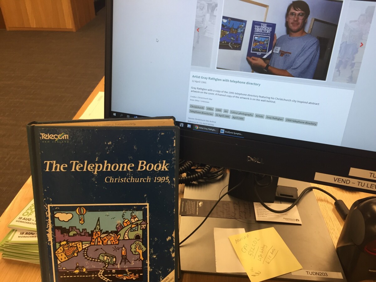 A copy of the 1995 telephone book with an image from the Discovery Wall website behind showing the person who designed the artwork for the book holding up a copy. Taken on Tuakiri in Tūranga.