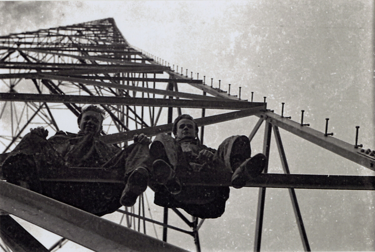 Unknown maintenance staff on one of the transmission masts.