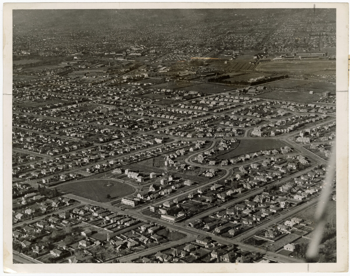 Aerial view of state housing settlement at Riccarton showing Riccarton Road and Paeroa Street.