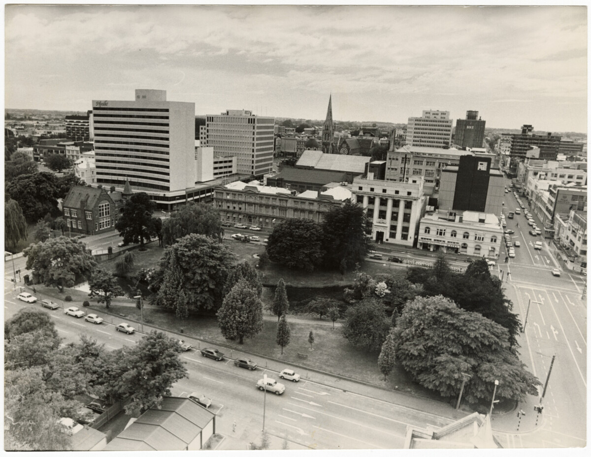 View of the city centre seen from the postal centre on Hereford Street. Looking east towards Cathedral Square.