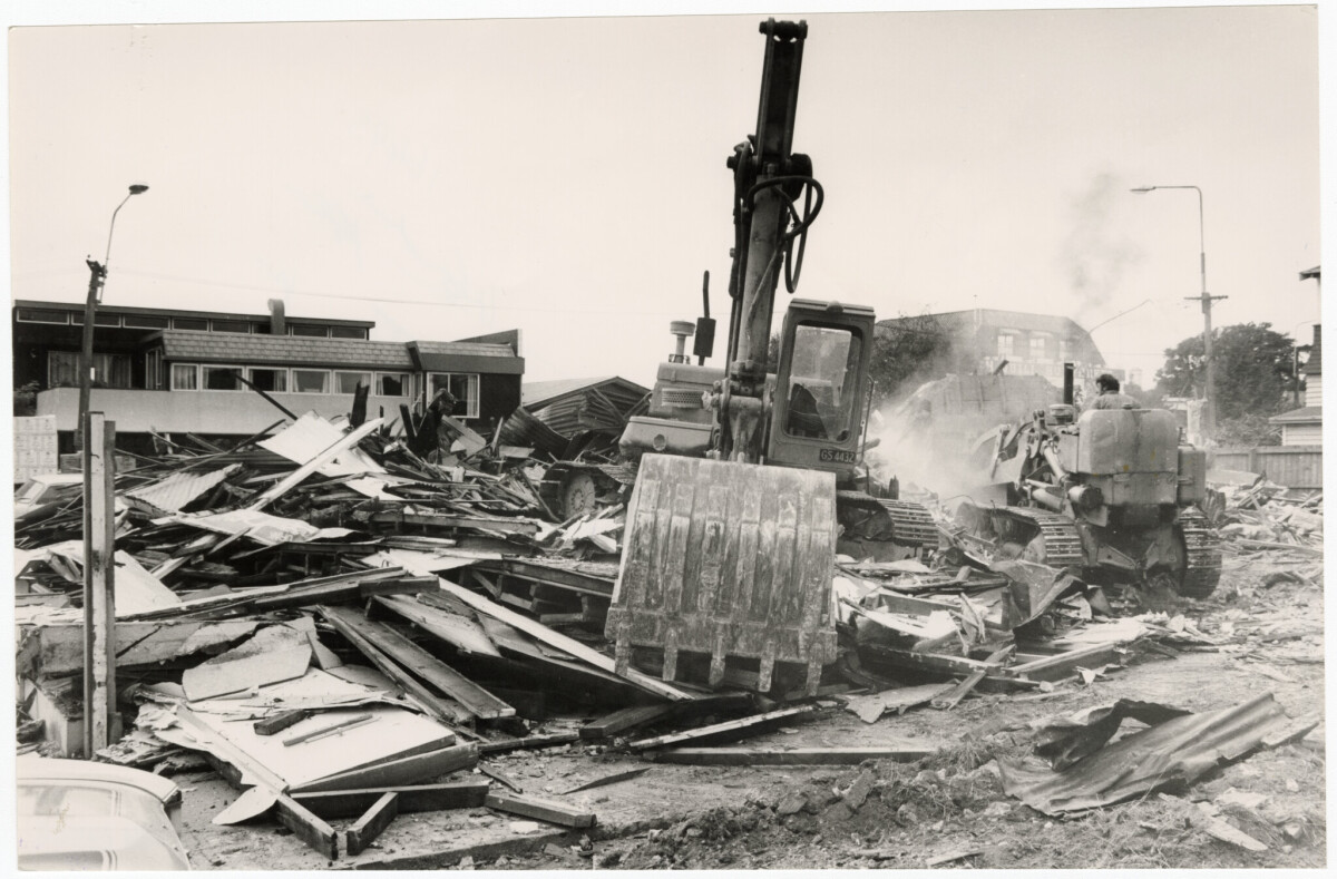 Demolition of the block of shops on the corner of Colombo Street and Bealey Avenue.