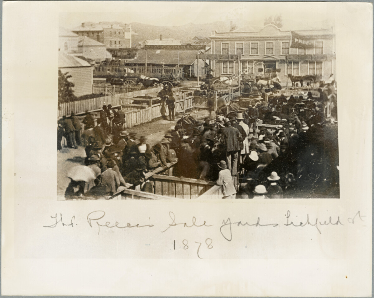 View of people gathered at Preece's sale yards on Lichfield Street.
