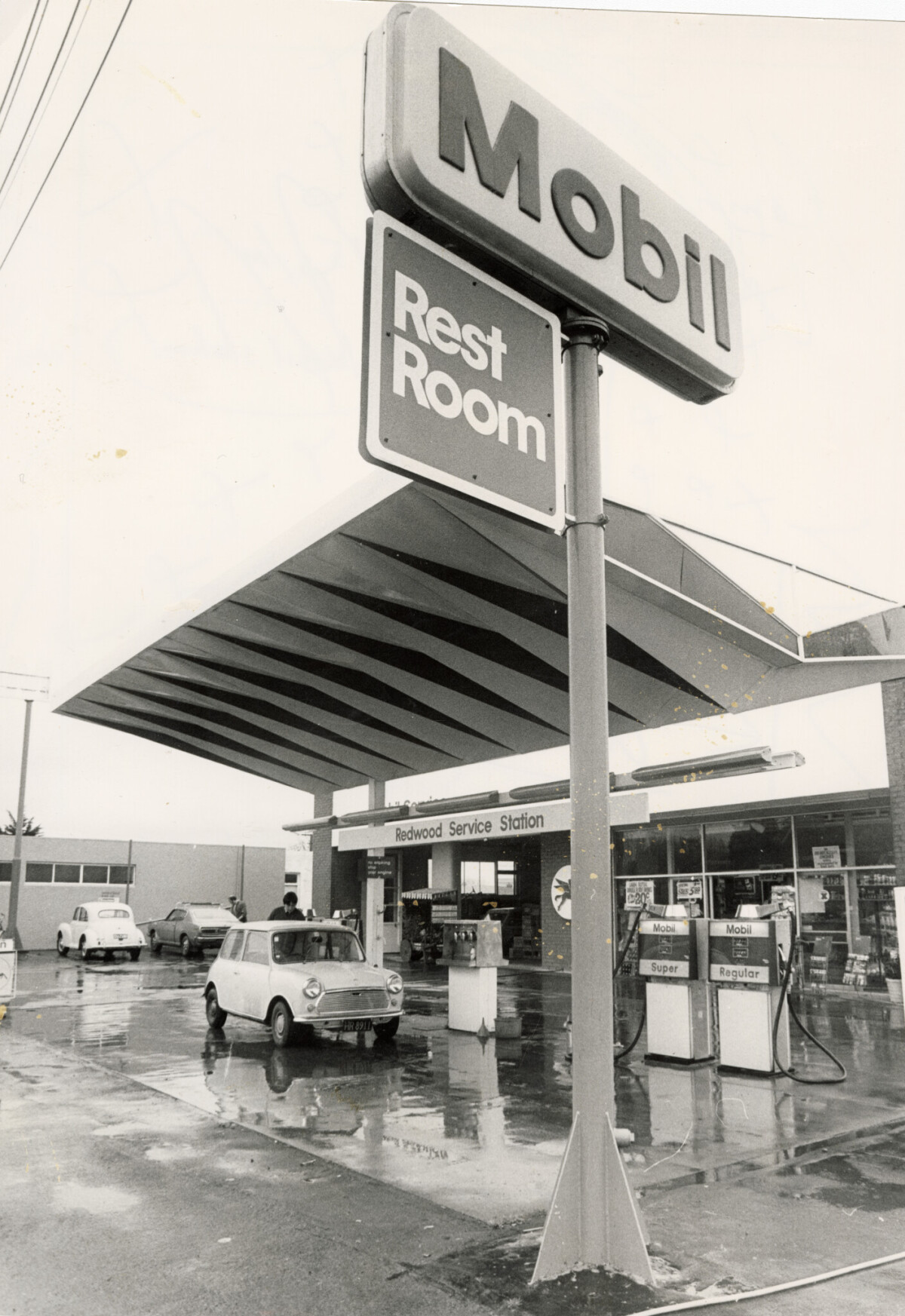 Exterior of the Redwood Mobil service station on the corner of Main North Road and Prestons Road.
