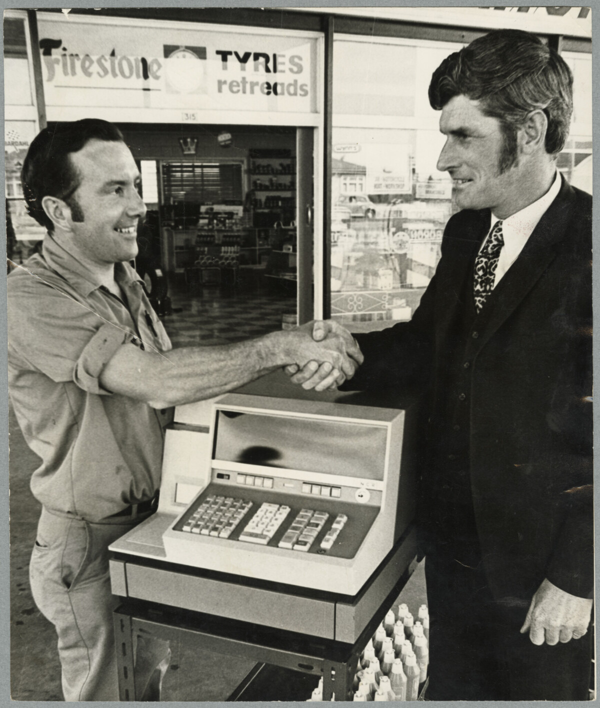 Don Harrison, sales supervisor for the National Cash Register Company, congratulating Murray McIver of the Midway Service Station on the Main North Road. Between them is a NCR 230.