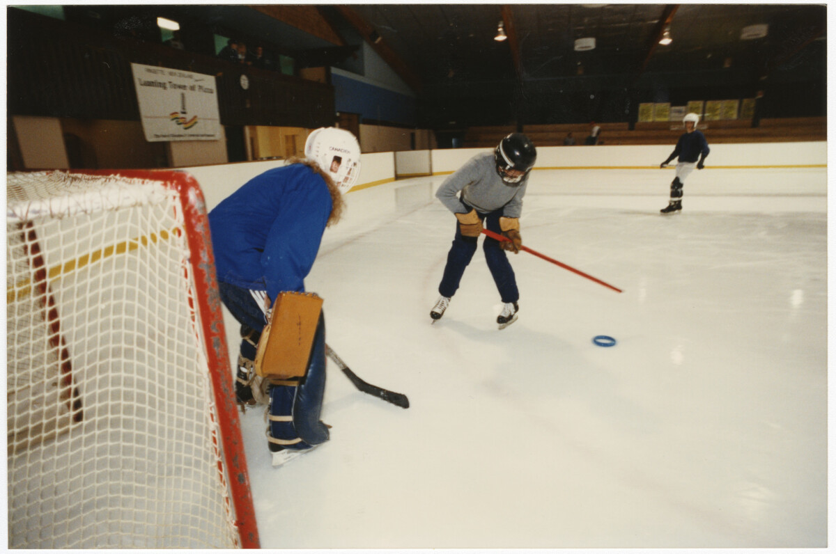 Katrina Painter from Avondale of the Jets, Lorna Zach of Redcliffs and (in background) Jeff Peacock of Burnside practising skating, shooting and saving goals for ice hockey at the ice rink at 495 Brougham Street.