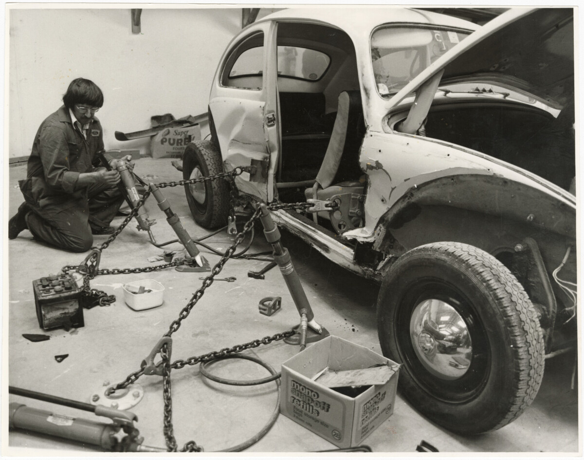 Allan Bayard uses the Mayrack Genie chasis straightening equipment on a volkswagen at Brown and Patterson panelbeaters at 114 Hazeldean Road in Addington.