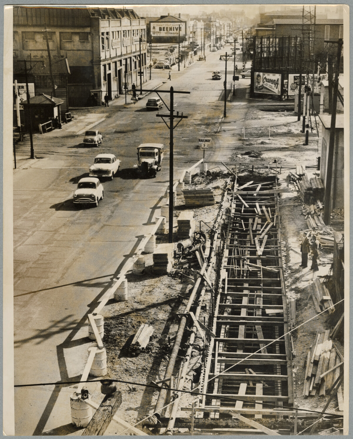 Construction of the Colombo Street overhead bridge looking north towards Cathedral Square.