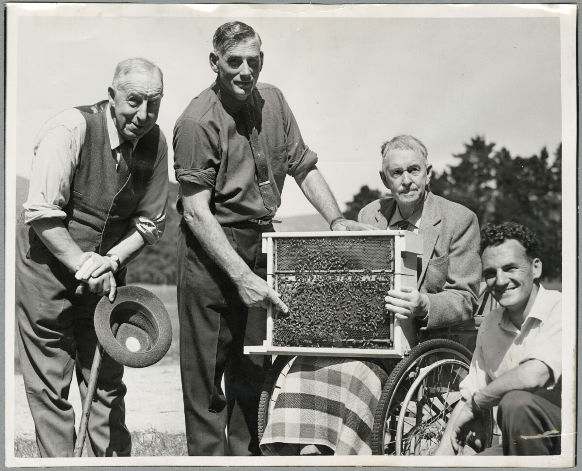 New Zealand Beekeepers' Association members meeting at Tai Tapu Domain. Pictured are, from left, George Gumbrell, Harry Cloake, W.B. Bray and David Penrose.