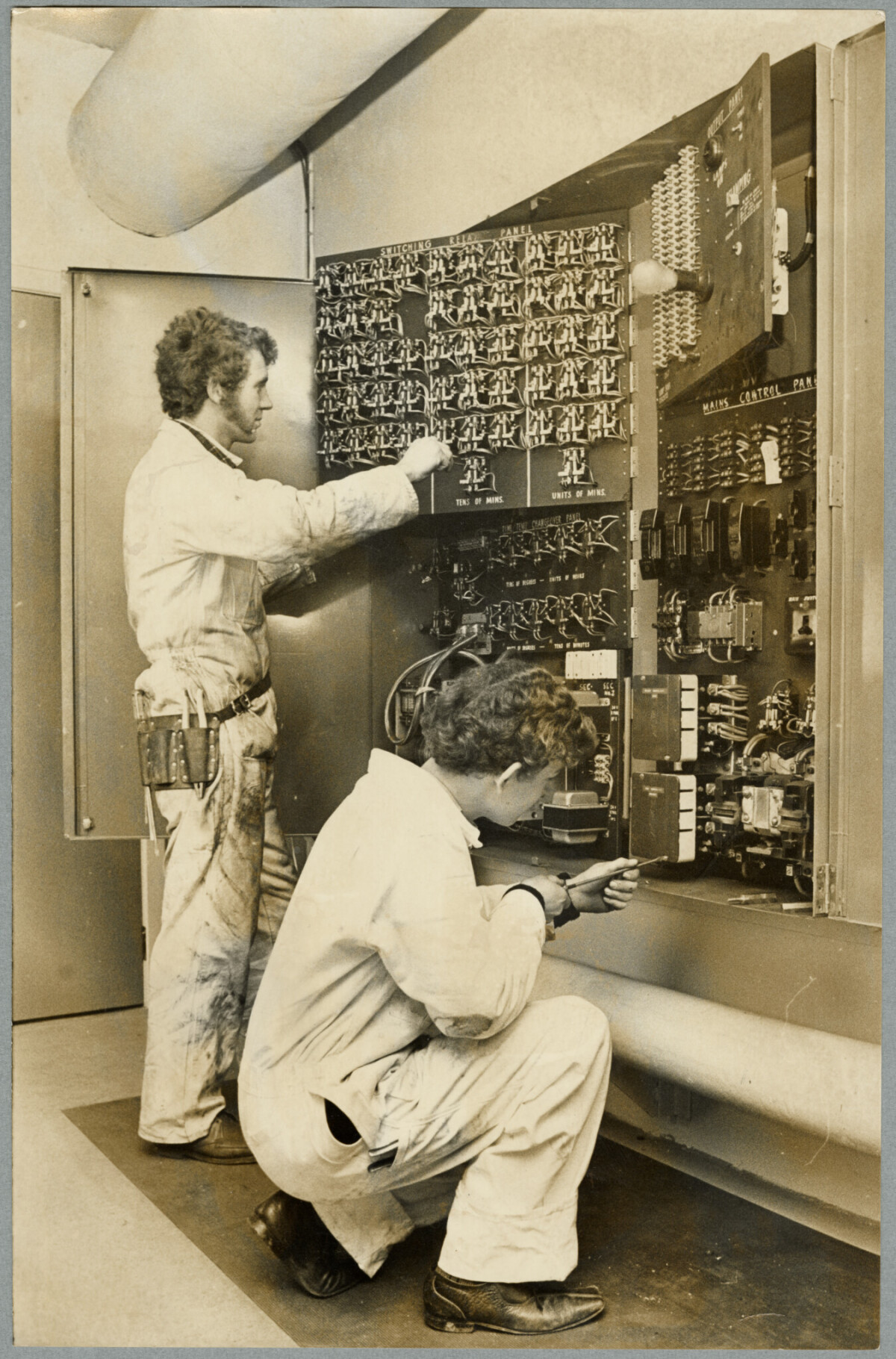Electricians Murray Sanders (left) and Gregory Watts installing a new bank of relays on the master clock unit at the Government Life building in preparation for a changeover to the Celsius temperature scale.