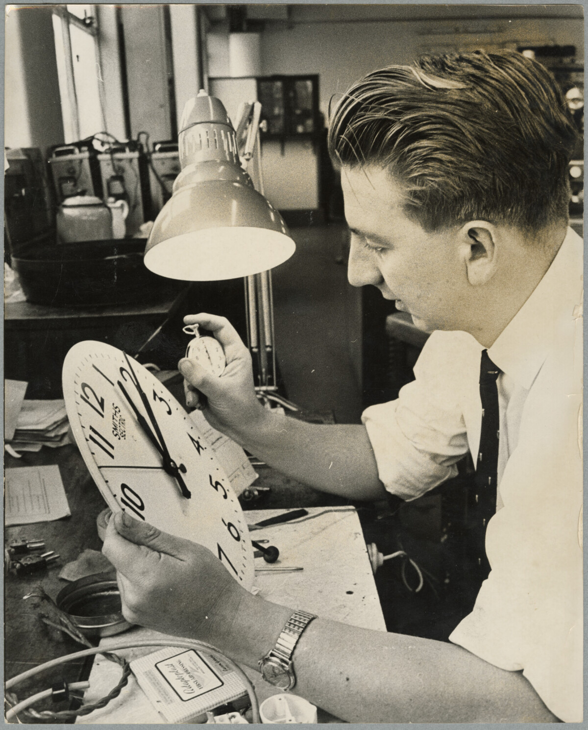 M.E.D. test assistant Don Donaldson repairing an electric clock.