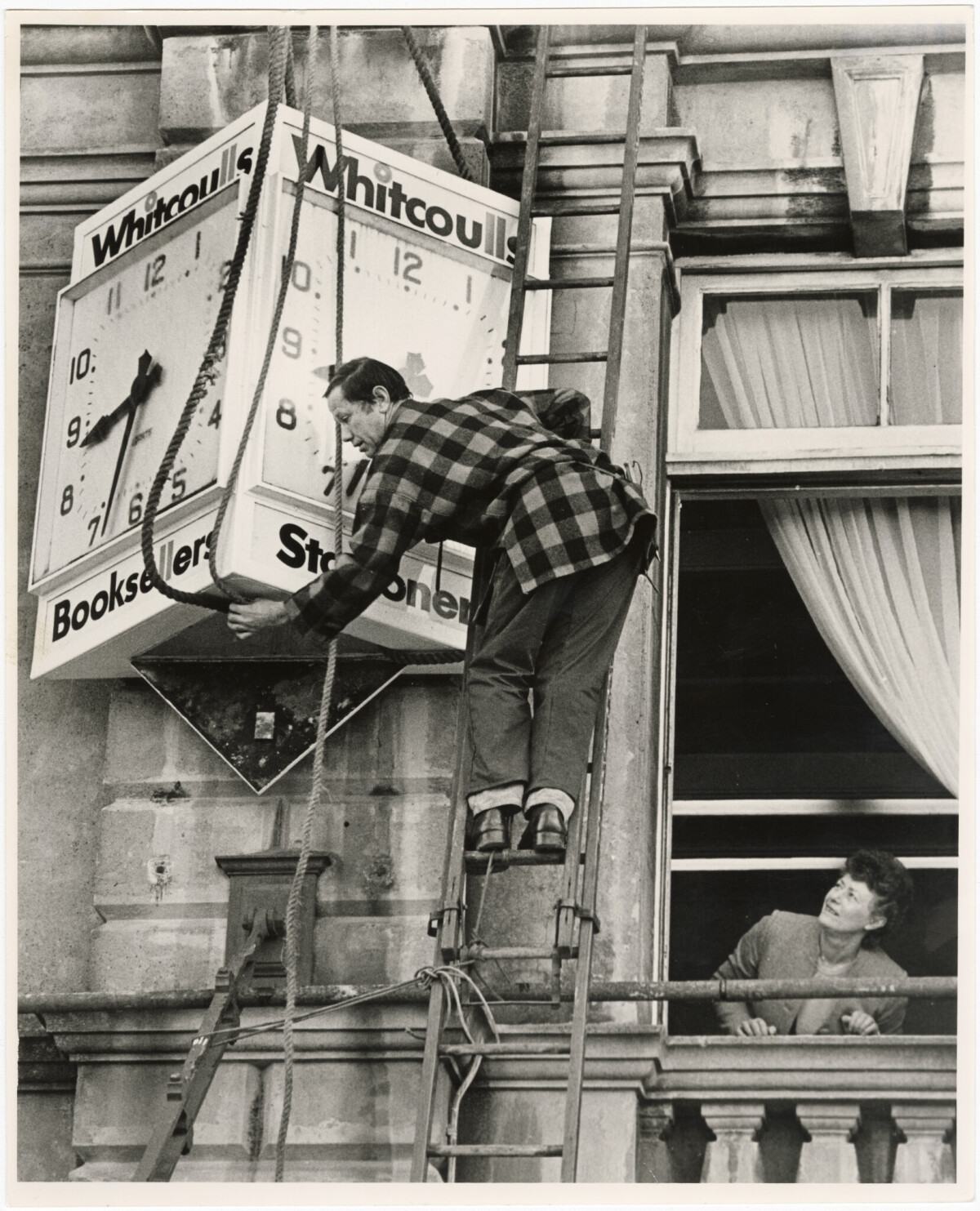 View of electrician Gordon Williams disconnecting the clock above the Whitcoulls shop on Cashel Street. Looking on is Mrs Bette Sheffield a sales assistant for Whitcoulls.