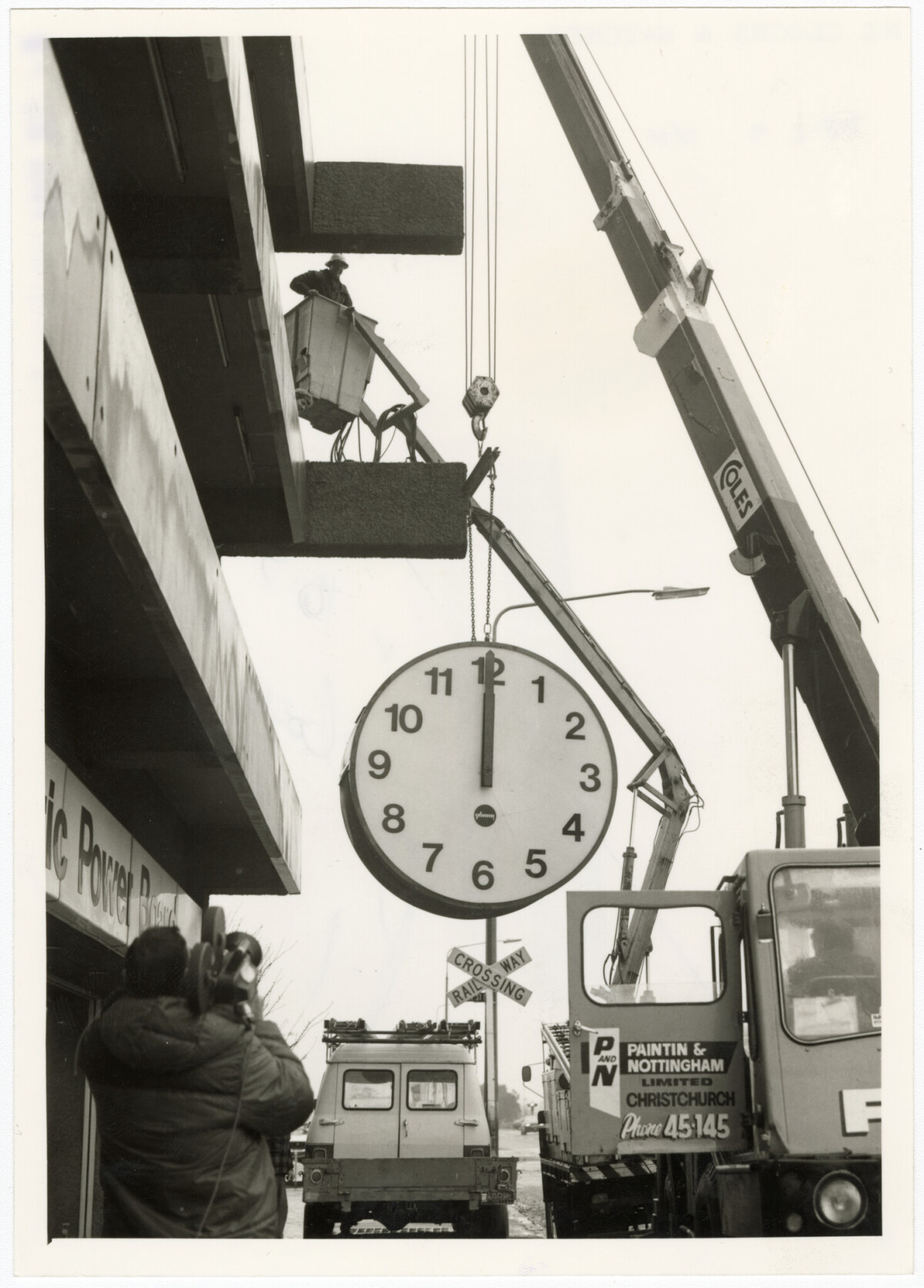Re-installation, following maintenance, of the clock on the Central Canterbury Electric Power Board Main South Road headquarters on the corner of Main South Road and Brynley Street in Hornby.