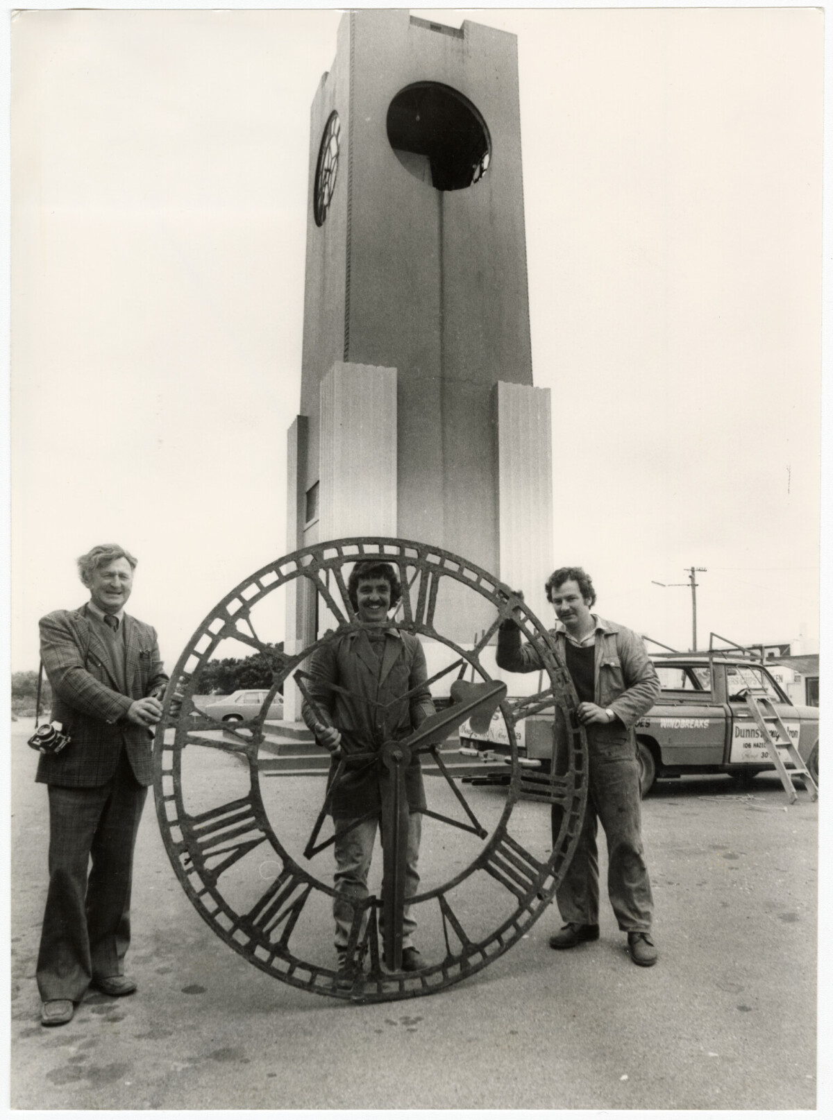 Richard Dunn (left), John Anderson and Peter Dunn with the New Brighton clock face which was removed for repairs.