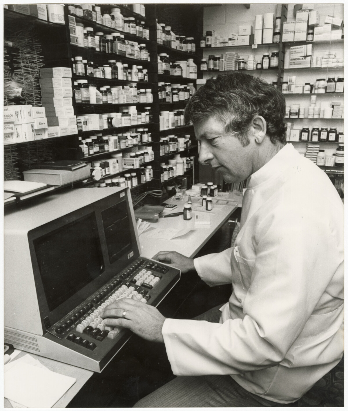 Neville Bullock, a pharmacist at Shirley Pharmacy at 12 Marshland Road, consulting his F5 3310 computer for a new prescription in the dispensary.