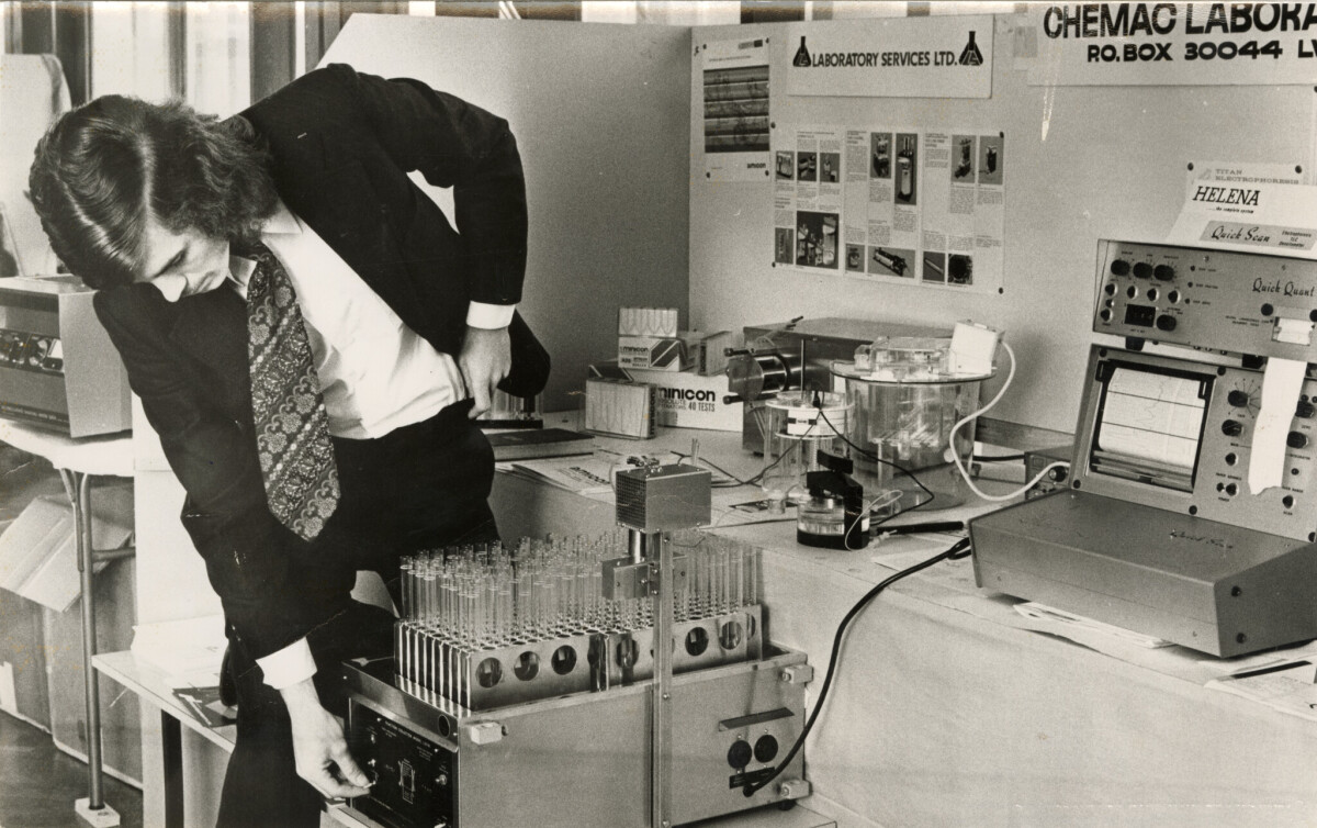 J. Turnbull with a fraction collector at the New Zealand Institute of Chemists conference at Ilam.