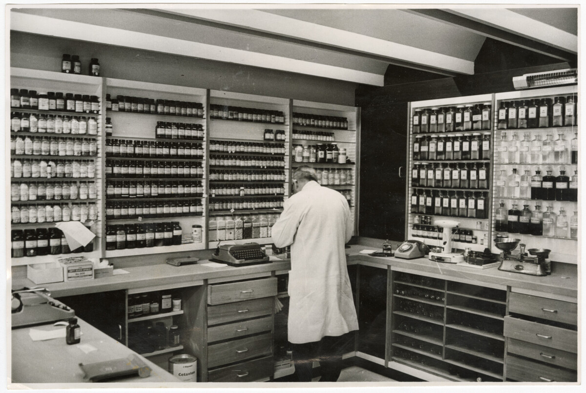 Interior view of a pharmacist working in the dispensery at Bonningtons The Chemists at 166 Cashel Street.