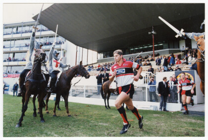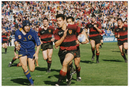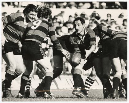 Captain of the Canterbury rugby team, Don Hayes, on the back of ...