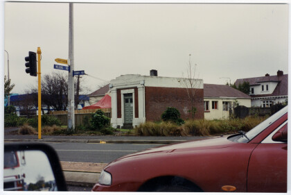 Car crash damage to the Bank of New Zealand on the corner of ...