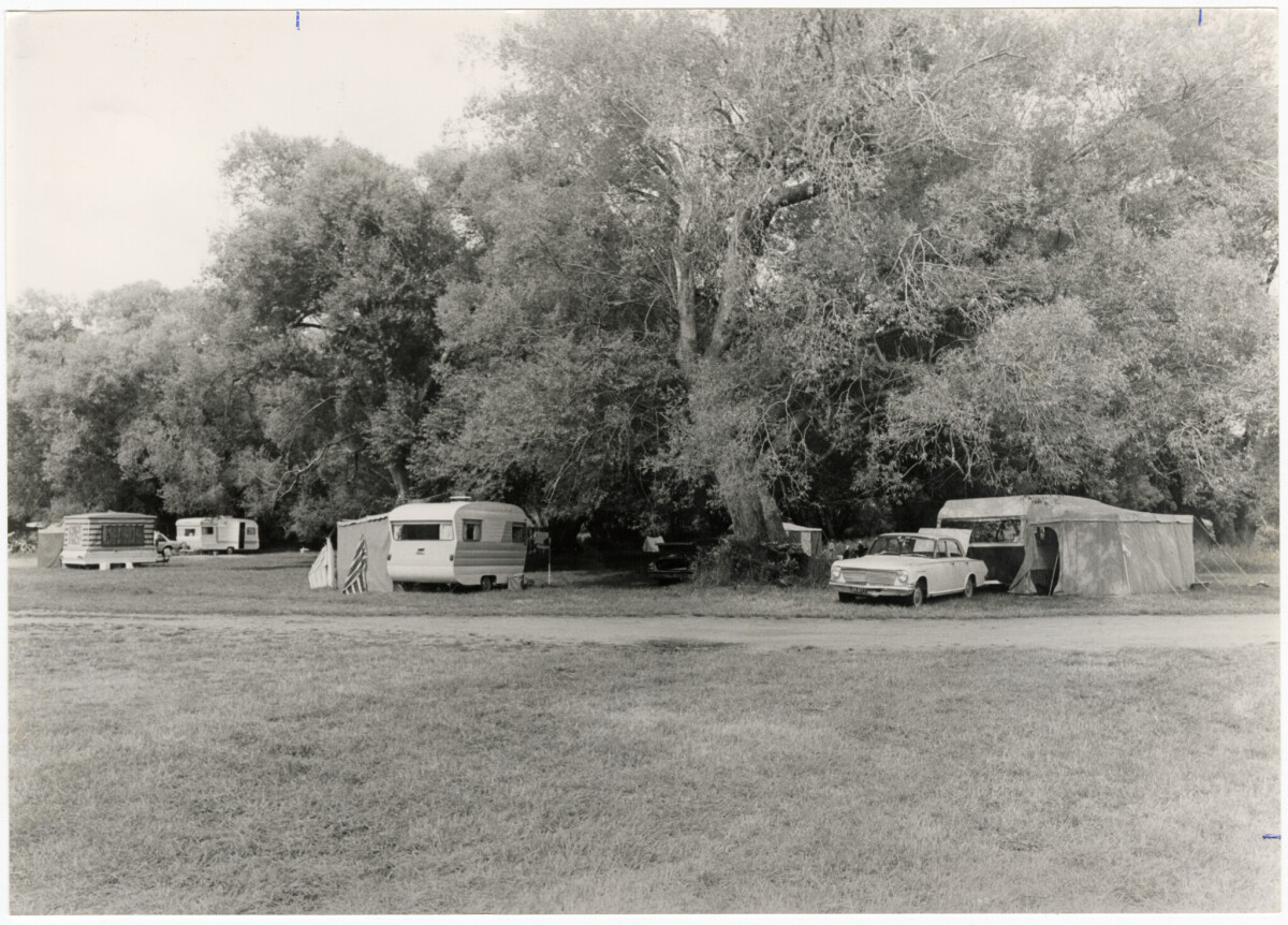 View of caravans and tents at a camping ground at the Glentunnel Domain on the Selwyn River.