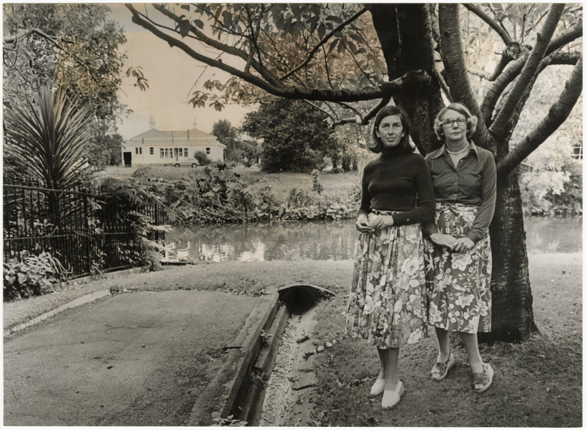Helen Cordner (left) and B. Penny on the bank of the Wairarapa Stream at the end of Bradnor Road, Fendalton. The pair are opposing the building of a bridge at the end of the cul-de-sac.