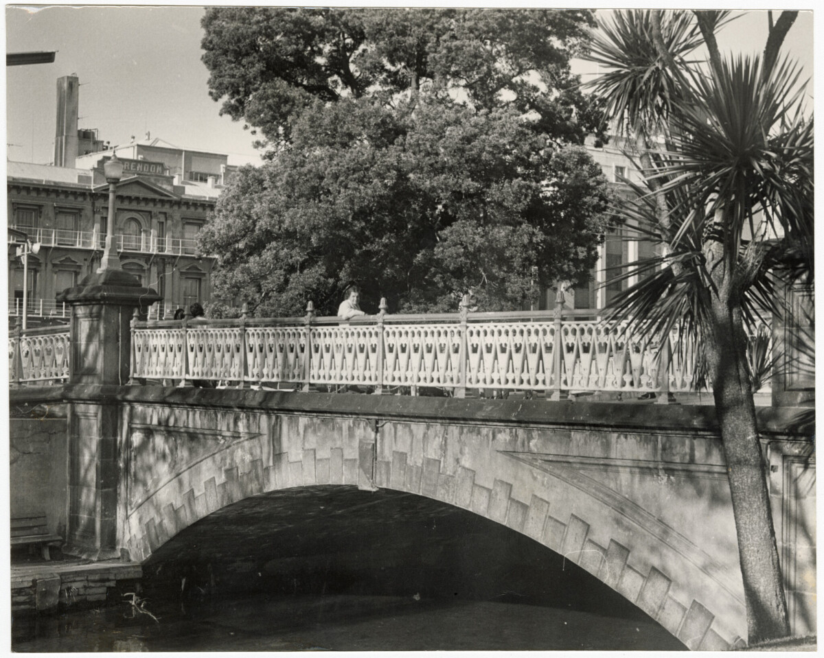 View of the Worcester Street bridge looking towards Oxford Terrace and to the Clarendon hotel on the corner with Worcester Street.