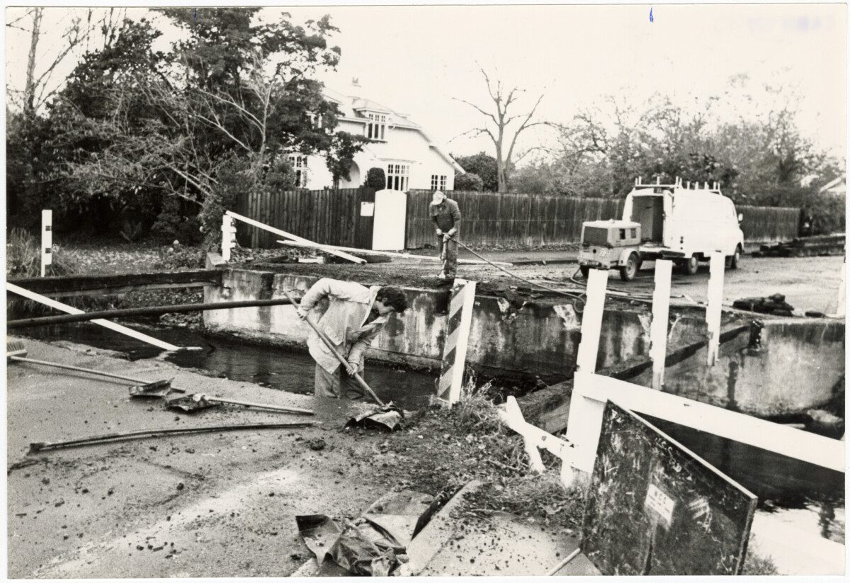 Waimairi County Council workmen removing the old bridge across the Wairarapa Stream in Poynder Avenue, Strowan.